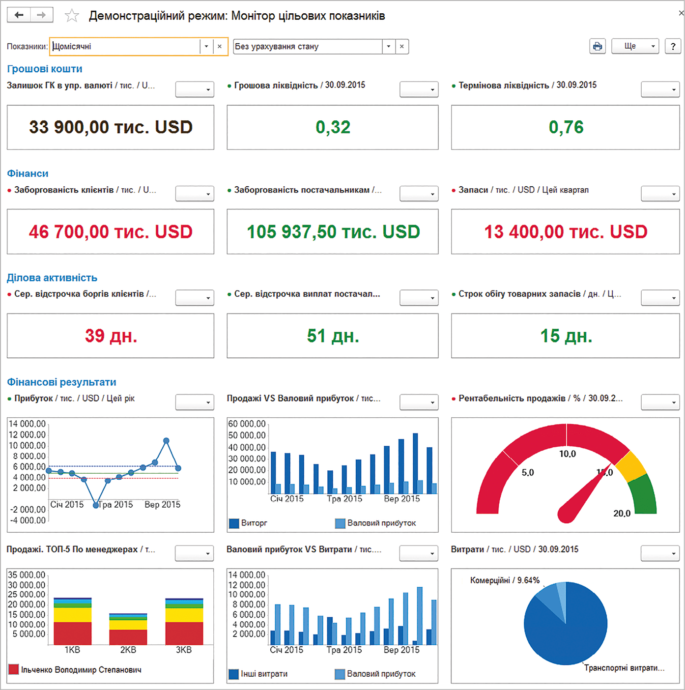- розрахунок ключових показників (ліквідність, рентабельність, платоспроможність тощо) у різних розрізах: за видами діяльності, регіонами, номенклатурою чи товарами.