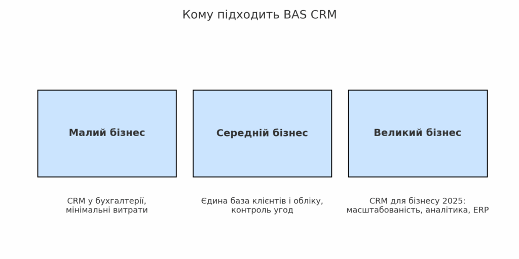 Отдельные CRM имеют четкий «потолок»: для малого бизнеса они слишком дороги, для холдингов — недостаточно функциональны. BAS CRM масштабируется вместе с компанией: от нескольких пользователей у ФОП до десятков отделов на крупном предприятии.