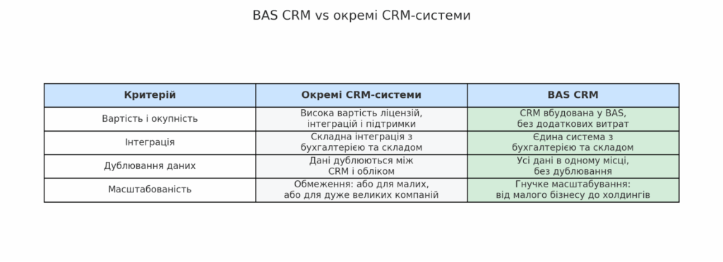 В отдельных CRM менеджер видит клиента, но не всегда знает его статус оплаты или наличие товара на складе. В BAS CRM эти данные доступны мгновенно, так как система объединяет продажи, склад и бухгалтерию.