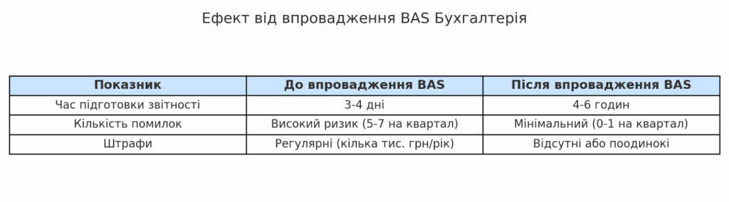 Приклад: компанія, яка раніше регулярно отримувала штрафи через неточності у звітах, після переходу на BAS протягом року не мала жодної відмови при подачі звітності.